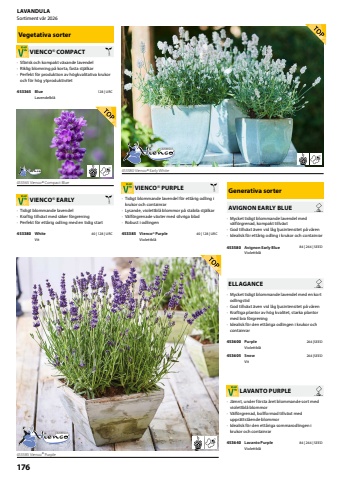 453385 Vienco%u00ae Purple453365 Vienco%u00ae Compact Blue453380 Vienco%u00ae Early WhiteVIENCO%u00ae PURPLE%u2022 Tidigt blommande lavendel f%u00f6r ett%u00e5rig odling i krukor och containrar%u2022 Lysande, violettbl%u00e5 blommor p%u00e5 stabila stj%u00e4lkar%u2022 V%u00e4lf%u00f6rgrenade v%u00e4xter med silvriga blad%u2022 Robust i odlingen453385Vienco%u00ae Purple 40 | 128 | URCViolettbl%u00e5Generativa sorterAVIGNON EARLY BLUE%u2022 Mycket tidigt blommande lavendel med v%u00e4lf%u00f6rgrenad, kompakt tillv%u00e4xt%u2022 God tillv%u00e4xt %u00e4ven vid l%u00e5g ljusintensitet p%u00e5 v%u00e5ren%u2022 Idealisk f%u00f6r ett%u00e5rig odling i krukor och containrar453580Avignon Early Blue 84 | 264 | SEEDViolettbl%u00e5ELLAGANCE%u2022 Mycket tidigt blommande lavendel med en kort odlingstid%u2022 God tillv%u00e4xt %u00e4ven vid l%u00e5g ljusintensitet p%u00e5 v%u00e5ren%u2022 Kraftiga plantor av h%u00f6g kvalitet, starka plantor med bra f%u00f6rgrening%u2022 Idealisk f%u00f6r den ett%u00e5riga odlingen i krukor och containrar453600Purple 264 |SEEDViolettbl%u00e5453605Snow 264 |SEEDVitLAVANTO PURPLE%u2022 J%u00e4mnt, under f%u00f6rsta %u00e5ret blommande sort med violettbl%u00e5 blommor%u2022 V%u00e4lf%u00f6rgrenad, bollformad tillv%u00e4xt med uppr%u00e4ttst%u00e5ende blommor%u2022 Idealisk f%u00f6r den ett%u00e5riga sommarodlingen i krukor och containrar453640Lavanto Purple 84 | 264 | SEEDViolettbl%u00e5VIENCO%u00ae COMPACT%u2022 Sf%u00e4risk och kompakt v%u00e4xande lavendel%u2022 Riklig blomning p%u00e5 korta, fasta stj%u00e4lkar%u2022 Perfekt f%u00f6r produktion av h%u00f6gkvalitativa krukor och f%u00f6r h%u00f6g ytproduktivitet453365Blue 128 | URCLavendelbl%u00e5Vegetativa sorterVIENCO%u00ae EARLY%u2022 Tidigt blommande lavendel%u2022 Kraftig tillv%u00e4xt med s%u00e4ker f%u00f6rgrening%u2022 Perfekt f%u00f6r ett%u00e5rig odling med en tidig start453380White 40 | 128 | URCVit176