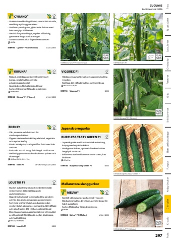518900 Cyrano%u00ae F1 (Dominica)518940 Eden F1519050 Kiruna%u00ae F1 (Fitness)519440 Burpless Tasty Green F1519500 Melva%u00ae F1 (Midios)CYRANO%u00ae%u2022 Gurksort med kraftig tillv%u00e4xt, som %u00e4r l%u00e4tt att odla, med h%u00f6g mj%u00f6ldaggsresistens%u2022 Uniforma, m%u00f6rkgr%u00f6na, gl%u00e4nsande frukter med b%u00e4sta m%u00f6jliga h%u00e5llbarhet%u2022 Idealisk f%u00f6r jordodlingar, mycket tillf%u00f6rlitlig, garanterar h%u00f6gsta avkastningar%u2022 Sorten Dominica har f%u00f6ljande resistenser:HR PM518900Cyrano%u00ae F1 (Dominica) V | 84 | SEEDEDEN F1%u2022 V%u00e5r-, sommar- och h%u00f6stsort f%u00f6r v%u00e4xthusproduktion.%u2022 %u00d6ppen v%u00e4xt med m%u00f6rkt f%u00e4rgade blad, vegetativ och mycket kraftig%u2022 Blankt m%u00f6rkgr%u00f6n, kraftigt r%u00e4lad frukt med hals i mitten%u2022 Fruktvikt 300 till 350 g, fruktl%u00e4ngd 33 till 36 cm%u2022 Mellanliggande motst%u00e5ndskraft mot pulver- och dunm%u00f6gelHR Ccu / CVYV; IR Px / Pcu518940Eden F1 DE-%u00d6KO-013 | V | 84 | SEEDKIRUNA%u00ae%u2022 Robust, mj%u00f6ldaggsresistent kvalitetssort%u2022 L%u00e5nga, smala frukter och h%u00f6g avkastningspotential%u2022 Idealisk %u00e4ven f%u00f6r kalla jordodlingar%u2022 Sorten Fitness har f%u00f6ljande resistenser:IR PM/CMV519050Kiruna%u00ae F1 (Fitness) V | 84 | SEEDLOUSTIK F1%u2022 Mycket avkastningsrik sort med intermedi%u00e4r resistens mot %u00e4kta mj%u00f6ldagg och gurkmosaikvirus%u2022 Uppv%u00e4rmd substrat- och markodling p%u00e5 v%u00e5ren och f%u00f6r den andra omg%u00e5ngen p%u00e5 sommaren%u2022 Sort med kraftig tillv%u00e4xt, producerar redan mycket tidigt gl%u00e4nsande, m%u00f6rkgr%u00f6na, l%u00e4tt r%u00e4lade och raka frukter, 425%u2013450 g, i optimal l%u00e4ngd%u2022 Den h%u00f6ga avkastningspotentialen %u00e4r ett resultat av ett optimalt f%u00f6rh%u00e5llande mellan bladmassa och frukts%u00e4ttningHR Ccu; IR CMV/Px519100Loustik F1 SEEDVIGOREX F1%u2022 H%u00e4rdig ormgurka f%u00f6r kall och uppv%u00e4rmd odling i marken%u2022 Kraftiga, l%u00e4tt r%u00e4lade frukter ca 35 cm l%u00e5ngaHR Ccu/Cca; IR /Px519110Vigorex F1 SEEDJapansk ormgurkaBURPLESS TASTY GREEN F1%u2022 Japansk gurka med karakteristisk m%u00f6nstring, krispig med mjukt fruktk%u00f6tt%u2022 M%u00f6rkgr%u00f6na frukter, optimala f%u00f6r sk%u00f6rd vid en l%u00e4ngd p%u00e5 20%u201324 cm%u2022 Bildar enstaka hanblommor under stress, kan bli bitterIR Px/Pcu519440Burpless Tasty Green F1 SEEDMellanstora slanggurkorMELVA%u00ae%u2022 S%u00e4rskilt v%u00e4lsmakande gurka i midi%u2013typ orm%u2022 M%u00f6rkgr%u00f6na frukter, 23%u201325 cm, perfekt l%u00e4ngd f%u00f6r hj%u00e4rt-gurkaform%u2022 Sorten Midios har f%u00f6ljande resistens:HR PM519500Melva%u00ae F1 (Midios) V | 84 | SEEDSnittblommorGr%u00e4sPerennerOrmbunkarBlomsterblandningarPumporKrukgr%u00f6nsakerGr%u00f6nsakerKryddorFruktSuckulenter TriosRabattv%u00e4xter