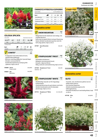 416250 Fashion Look Mix416600 Conito%u00ae Velvet416625 Conito%u00ae Mix417107 Snow Mountain417109 Starpleasure%u00ae FrostF%u00d6RB%u00c4TTRAD417115 Starpleasure%u00ae White417120 GlitzCELOSIA SPICATACELOSIAAMARANTHACEAE1300II-V20-226-103-4*) LjusgroendeSortConito%u00ae10-12 10-1216-20-(-)CONITO%u00ae%u2022 Krukplym%u00f6rt med m%u00f6rka blad och korta, uppr%u00e4tta blomst%u00e4llningar%u2022 Blommor med l%u00e5ng h%u00e5llbarhet i lysande f%u00e4rger%u2022 Attraktiv sommarartikel f%u00f6r kombinationsplantering med ljung eller cyklamen, h%u00f6jd ca 20 cm416600Velvet 264 |SEEDPurpurviolett416625Mix 264 |SEEDBlandningCHAMAESYCE HYPERICIFOLIA (EUPHORBIA)SN%u00d6T%u00d6RELEUPHORBIACEAESortSnow Mountain10-127-916-18x(x)Starpleasure%u00ae Frost11-127-916-18x(x)Starpleasure%u00ae White11-137-916-18x(x)Glitz11-137-918-24xVegetativa sorterSNOW MOUNTAIN%u2022 Rikligt blommande rabattv%u00e4xt med otaliga, vita enskilda blommor%u2022 Kulformad, kompakt tillv%u00e4xt med god f%u00f6rgrening%u2022 Vacker, l%u00e4ttsk%u00f6tt kombinationspartner %u00e4ven f%u00f6r fullt soliga platser, h%u00f6jd ca 20 cm417107Snow Mountain 128 | URCVitSTARPLEASURE%u00ae FROST%u2022 Halvdubbla vita blommor%u2022 M%u00f6rkgr%u00f6nt, kontrasterande l%u00f6vverk%u2022 Kompakt, v%u00e4lgrenad tillv%u00e4xt%u2022 Riklig, oavbruten sommarblomning, h%u00f6jd ca 25 cm417109Starpleasure%u00ae Frost 128 | URCF%u00d6RB%u00c4TTRADVitSTARPLEASURE%u00ae WHITE%u2022 Medelkraftigt v%u00e4xande sort f%u00f6r h%u00f6gv%u00e4rdiga krukprodukter%u2022 L%u00e5ngvarig blomning och god tolerans mot hetta%u2022 Attraktiv kombinationsv%u00e4xt f%u00f6r blandade planteringar, h%u00f6jd ca 25 cm417115Starpleasure%u00ae White 45 | 128 | URCVitGenerativa sorterGLITZ%u2022 Tusentals, sm%u00e5, vita blommor glittrar %u00f6ver de bollformade v%u00e4xterna%u2022 God, basn%u00e4ra f%u00f6rgrening%u2022 Attraktiv kombinationspartner f%u00f6r balkongplantering%u2022 Generativt f%u00f6r%u00f6kad sort med kraftig tillv%u00e4xt, h%u00f6jd ca 30 cm417120Glitz 264 |SEEDVitSnittblommorGr%u00e4sPerennerOrmbunkarBlomsterblandningarPumporKrukgr%u00f6nsakerGr%u00f6nsakerKryddorFruktSuckulenter TriosRabattv%u00e4xter
